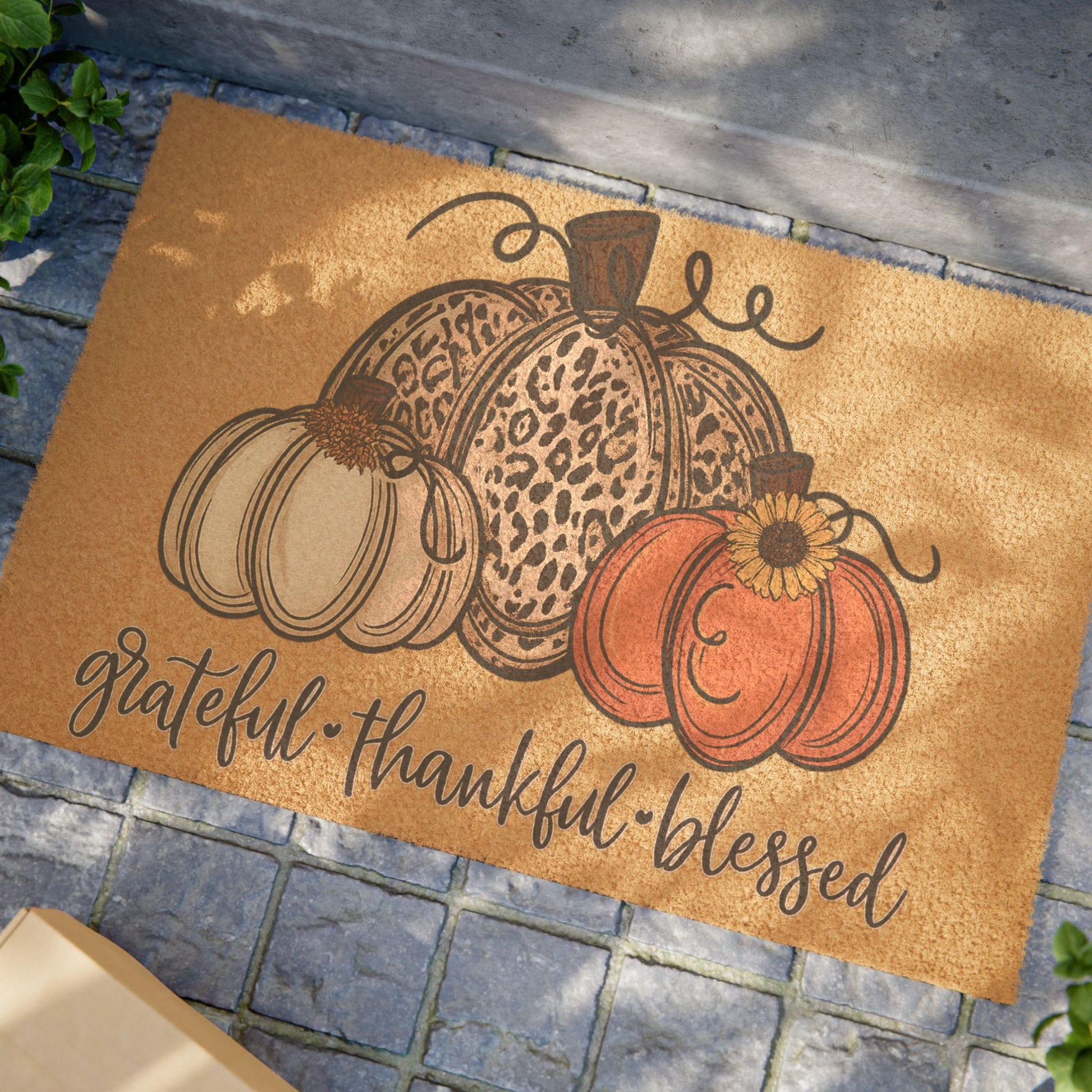 Grateful, Thankful, Blessed Fall Doormat – Autumn Pumpkin Welcome Mat