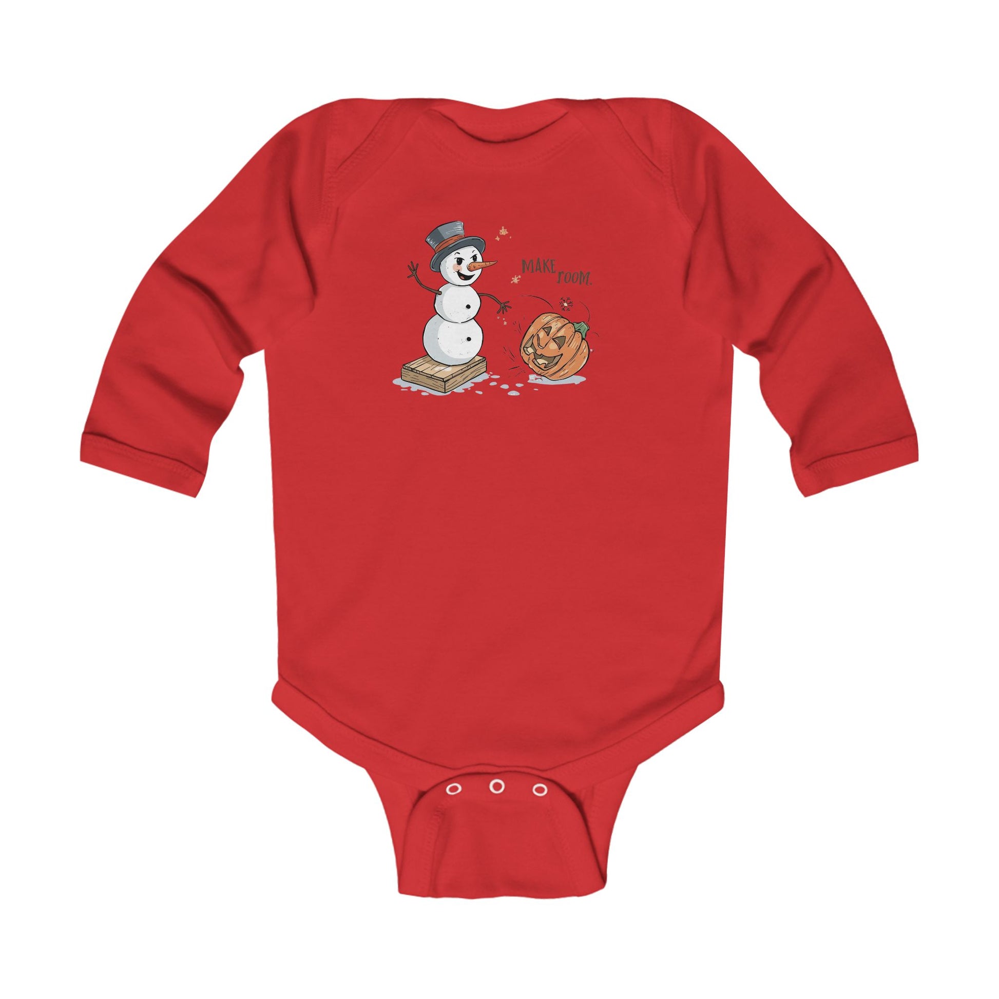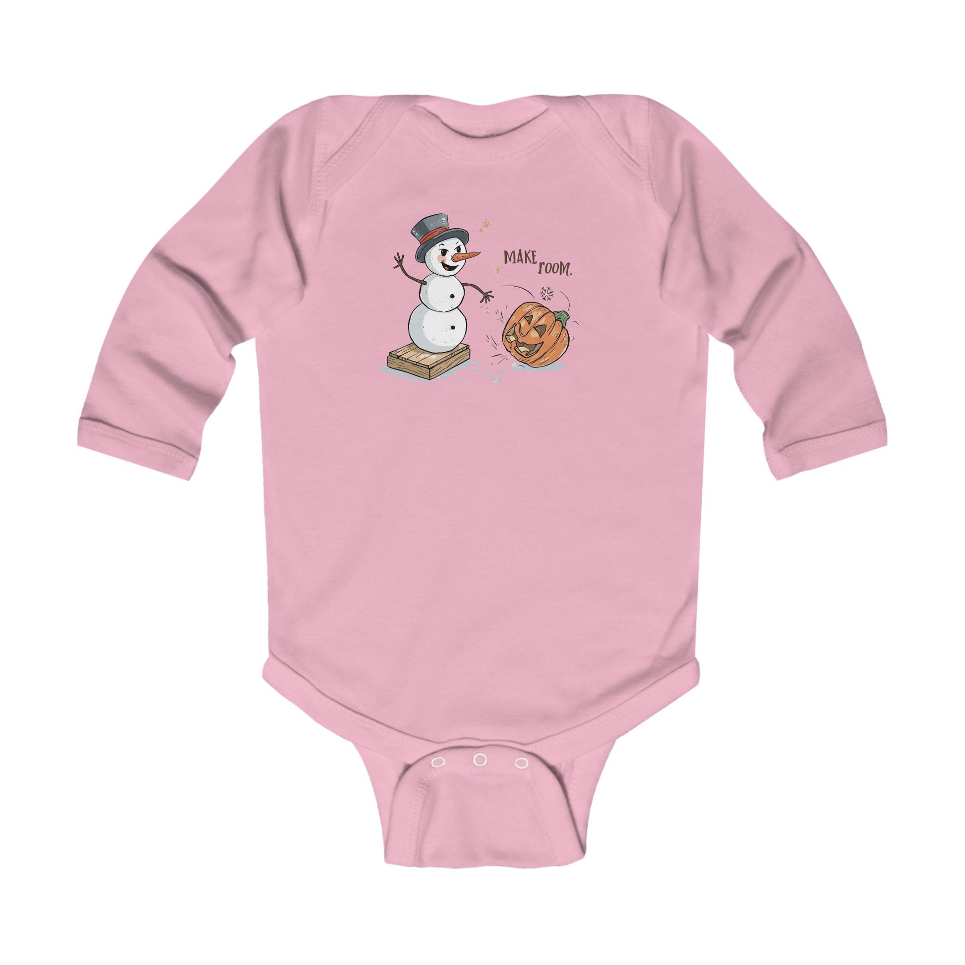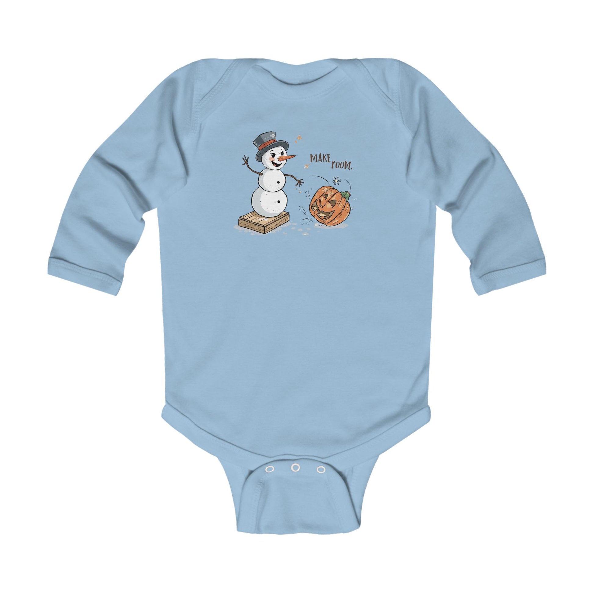 Let your littlest pumpkin celebrate the seasonal shift in style with our Fall to Winter “Make Room” Humorous Infant Onesie! This cozy long-sleeve bodysuit features a charming illustrated scene of a snowman boldly ushering winter into place while a surprised jack-o’-lantern rolls aside—perfect for families who love cute humor, fall vibes, and holiday transitions.